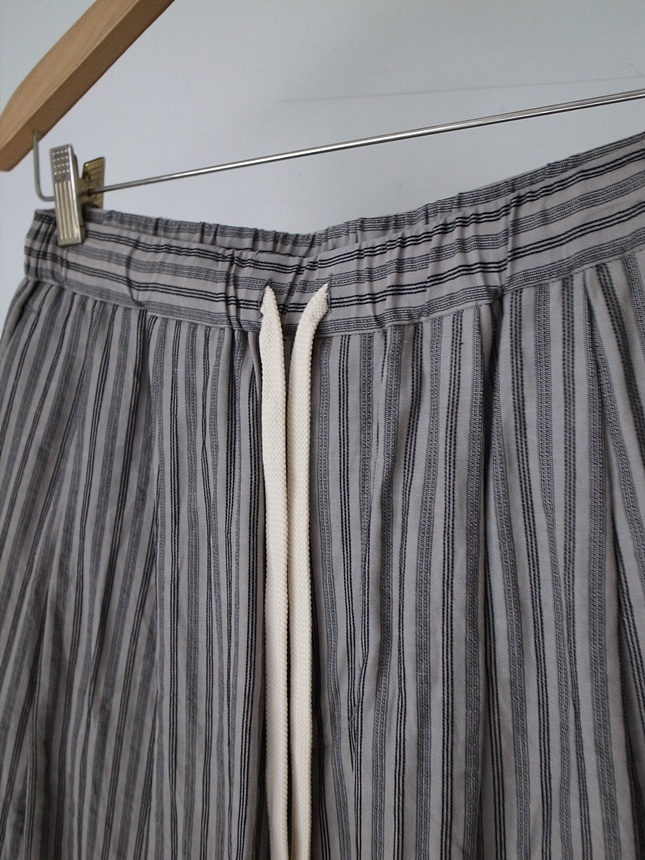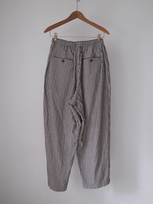 calmlence -DOUBLE PLEATED EASY TAPERED PANTS- material : RAYON 46%, LINEN 32%, COTTON 22% color : GREY STRIPE size : 1 price(incl.tax) : 64,900yen <<back