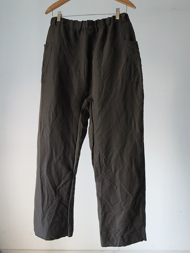 ware material : WOOL 50%, LINEN 50% color : KHAKI size : FREE *WAIST 39cm~49cm, RISE 33cm, INSEAM 77cm, HEM WIDTH 25cm price(incl.tax) : 33,000yen <<back